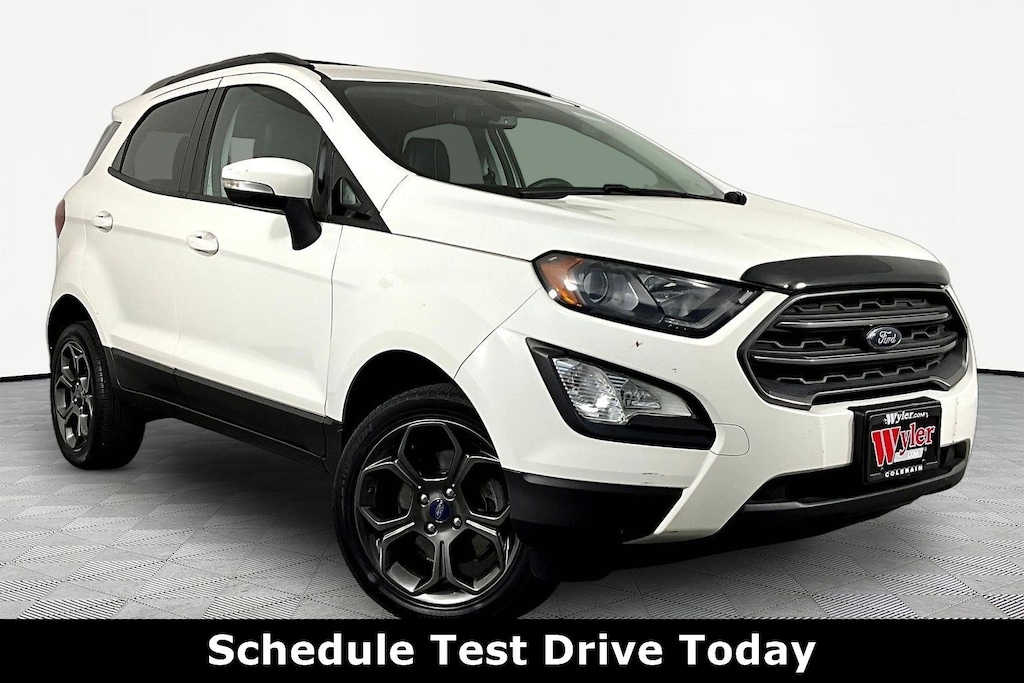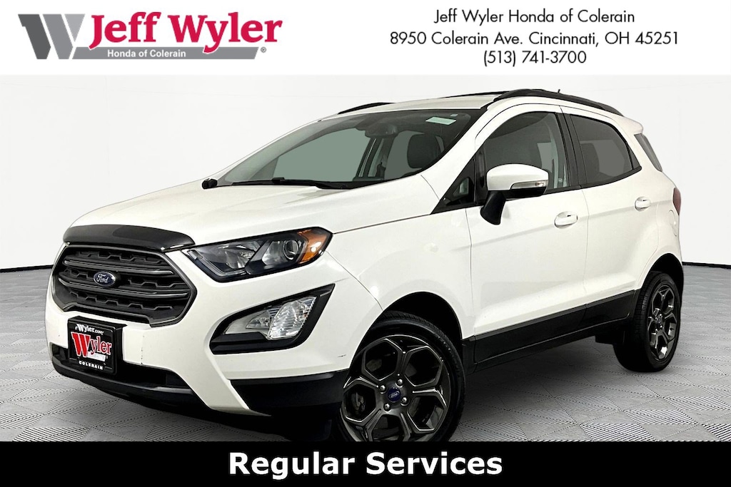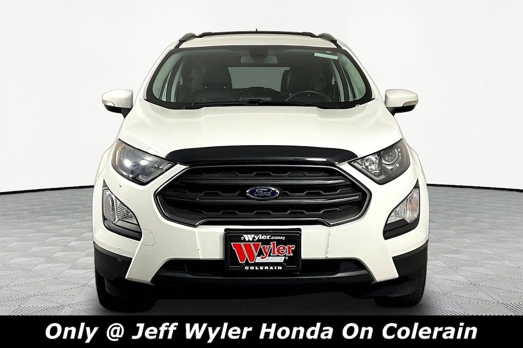 Jeff Wyler Honda of Colerain is pumped up to offer this good-looking 2018 Ford EcoSport SES in Diamond White. Well equipped with: Equipment Group 300A, SES Cold Weather Package (Front & Rear Floor Liners, Heated Sideview Mirrors, Heated Steering Wheel, and Windshield Wiper De-Icer), 4-Wheel Disc Brakes, 7 Speakers, ABS brakes, Air Conditioning, Alloy wheels, AM/FM radio: SiriusXM, AppLink/Apple CarPlay and Android Auto, Auto-dimming Rear-View mirror, Automatic temperature control, Axle Ratio: 3.51, Brake assist, Bumpers: body-color, Compass, Delay-off headlights, Driver door bin, Driver vanity mirror, Dual front impact airbags, Dual front side impact airbags, Electronic Stability Control, Emergency communication system: SYNC 3 911 Assist, Exterior Parking Camera Rear, Front anti-roll bar, Front Bucket Seats, Front Center Armrest, Front fog lights, Front reading lights, Front wheel independent suspension, Fully automatic headlights, Heated front seats, Illuminated entry, Knee airbag, Leather Shift Knob, Low tire pressure warning, Navigation System, Occupant sensing airbag, Outside temperature display, Overhead airbag, Overhead console, Panic alarm, Partial Leather-Trimmed Heated Bucket Seats, Passenger door bin, Passenger vanity mirror, Power door mirrors, Power driver seat, Power moonroof, Power steering, Power windows, Radio data system, Radio: AM/FM Stereo w/MP3 Capable, Rain sensing wipers, Rear anti-roll bar, Rear Parking Sensors, Rear seat center armrest, Rear side impact airbag, Rear window defroster, Rear window wiper, Remote keyless entry, Roof rack, SiriusXM Radio, Speed control, Speed-sensing steering, Split folding rear seat, Spoiler, Steering wheel mounted audio controls, SYNC 3 Communications & Entertainment System, SYNC Connect, Tachometer, Telescoping steering wheel, Tilt steering wheel, Traction control, Trip computer, Turn signal indicator mirrors, Variably intermittent wipers, and Wheels: 17" Premium Dark Tarnish Metallic-Painted.