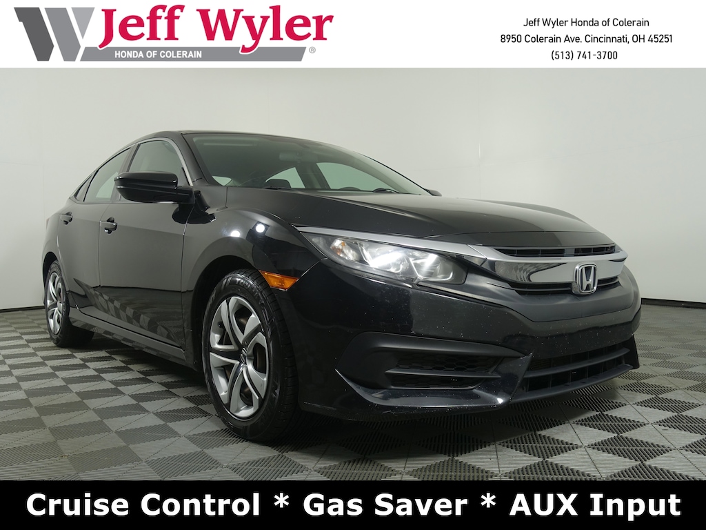 Jeff Wyler Honda of Colerain is pleased to offer this charming-looking 2018 Honda Civic LX in Crystal Black Pearl. Well equipped with: 16" Wheels w/Full Covers, 4 Speakers, 4-Wheel Disc Brakes, ABS brakes, Air Conditioning, AM/FM radio, Automatic temperature control, Brake assist, Bumpers: body-color, Cloth Seat Trim, Compass, Delay-off headlights, Driver door bin, Driver vanity mirror, Dual front impact airbags, Dual front side impact airbags, Electronic Stability Control, Exterior Parking Camera Rear, Four wheel independent suspension, Front anti-roll bar, Front Bucket Seats, Front Center Armrest, Front reading lights, Fully automatic headlights, Illuminated entry, Low tire pressure warning, Occupant sensing airbag, Outside temperature display, Overhead airbag, Panic alarm, Passenger door bin, Passenger vanity mirror, Power door mirrors, Power steering, Power windows, Radio data system, Radio: 160-Watt AM/FM Audio System, Rear anti-roll bar, Rear window defroster, Reclining Front Bucket Seats, Remote keyless entry, Security system, Speed control, Speed-sensing steering, Steering wheel mounted audio controls, Tachometer, Telescoping steering wheel, Tilt steering wheel, and Traction control.