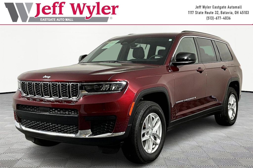 Jeff Wyler Eastgate Auto Mall is pumped up to offer this superb 2024 Jeep Grand Cherokee L Laredo in Velvet Red Pearlcoat. Well equipped with: Quick Order Package 23D Laredo X (Laredo X and Power Sunroof), Trailer Tow Package (180 Amp Alternator, 7 & 4 Pin Wiring Harness, Automatic Headlamp Leveling System, Class IV Receiver Hitch, Dual Exhaust Tips, Heavy-Duty Engine Cooling, Rear Load Leveling Suspension, and Trailer Hitch Zoom), 3.45 Rear Axle Ratio, 3rd row seats: split-bench, 4-Wheel Disc Brakes, 6 Speakers, ABS brakes, Air Conditioning, Alloy wheels, Anti-whiplash front head restraints, Automatic temperature control, Brake assist, Bumpers: body-color, Cloth Seats, Compass, Delay-off headlights, Driver door bin, Driver vanity mirror, Dual front impact airbags, Dual front side impact airbags, Electronic Stability Control, Emergency communication system, Four wheel independent suspension, Front anti-roll bar, Front Bucket Seats, Front Center Armrest w/Storage, Front dual zone A/C, Front License Plate Bracket, Front reading lights, Fully automatic headlights, Heated door mirrors, Illuminated entry, Knee airbag, Low tire pressure warning, Manual Fold Seatbacks, Normal Duty Suspension, Occupant sensing airbag, Outside temperature display, Overhead airbag, Overhead console, Panic alarm, ParkView Rear Back-Up Camera, Passenger door bin, Passenger vanity mirror, Power door mirrors, Power driver seat, Power steering, Power windows, Radio data system, Radio: Uconnect 5 w/8.4" Display, Rear air conditioning, Rear anti-roll bar, Rear reading lights, Rear window defroster, Rear window wiper, Reclining 3rd row seat, Remote keyless entry, Security system, Speed control, Speed-Sensitive Wipers, Split folding rear seat, Spoiler, Steering wheel mounted audio controls, Tachometer, Telescoping steering wheel, Tilt steering wheel, Traction control, Trip computer, Variably intermittent wipers, Voltmeter, and Wheels: 18" x 8.0" Fully Painted Aluminum. CARFAX One-Owner. Clean CARFAX. Ask about available certifications. Used vehicles 10 years of age or newer with less than 100,000 miles are eligible for the Wyler Assurance Program, but eligible vehicles must pass our reconditioning process and multi-point inspection. Provided the vehicle passes inspection, vehicles will be eligible for the 6 month/6,000 mile limited warranty. The 6 month/6,000 mile limited warranty is NOT available on AS-IS vehicles, wholesale vehicles, lease buyback/pass-thru vehicles or un-inspected vehicles. Note that this program can also apply to vehicles where the remaining factory coverage is less than 6 months or 6,000 miles. Please check the Federal Trade Commission (FTC) Buyers guide on the vehicle for full details as to whether or not warranty coverage may apply. Contact Dealer for additional details. The Wyler Assurance 6 month/6,000 Mile limited warranty ends 6 months from the date of the Retail Purchase Agreement (BUYERS ORDER) or when the vehicle's odometer registers 6,000 additional miles to the mileage listed on the BUYERS ORDER, whichever comes first. Your Deductible - The warranty holder on your contract pays the first $100 of each covered repair.