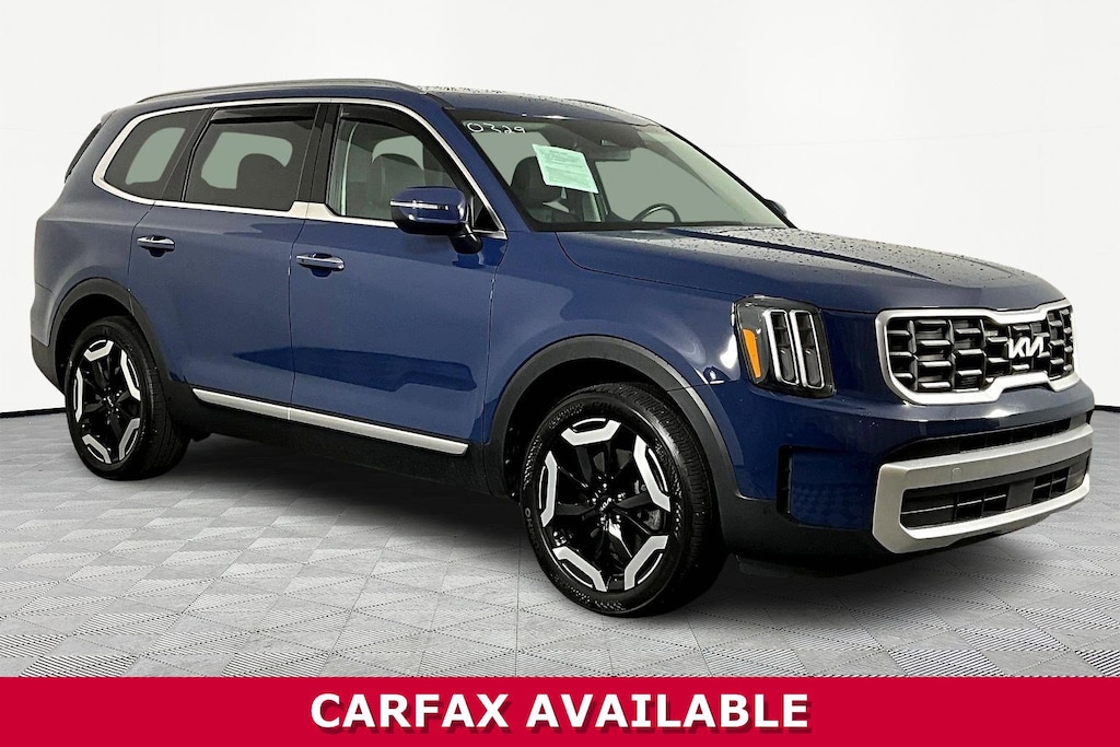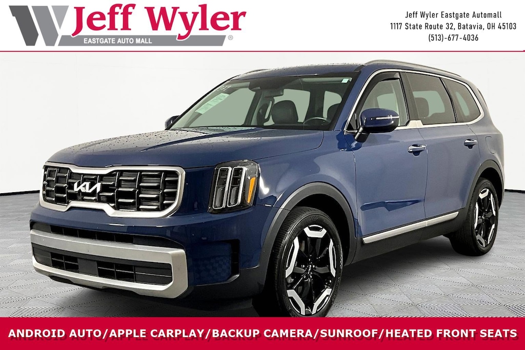 Jeff Wyler Eastgate Auto Mall is honored to offer this great-looking 2024 Kia Telluride S in Midnight Lake Blue. Well equipped with: S Sunroof Package (Power Sunroof w/Sunshade), 3.510 Axle Ratio, 3rd row seats: split-bench, 4-Wheel Disc Brakes, 6 Speakers, ABS brakes, Air Conditioning, Alloy wheels, AM/FM radio: SiriusXM, Apple CarPlay & Android Auto, Auto High-beam Headlights, Automatic temperature control, Brake assist, Bumpers: body-color, Carpet Floor Mats, Delay-off headlights, Driver door bin, Driver vanity mirror, Dual front impact airbags, Dual front side impact airbags, Electronic Stability Control, Emergency communication system: 911 Connect, Exterior Parking Camera Rear, Four wheel independent suspension, Front anti-roll bar, Front Bucket Seats, Front Center Armrest, Front dual zone A/C, Front reading lights, Fully automatic headlights, Heated door mirrors, Heated Front Bucket Seats, Heated front seats, Illuminated entry, Knee airbag, Leather Shift Knob, Leather steering wheel, Low tire pressure warning, Navigation System, Occupant sensing airbag, Outside temperature display, Overhead airbag, Overhead console, Panic alarm, Passenger door bin, Passenger vanity mirror, Power door mirrors, Power driver seat, Power steering, Power windows, Radio data system, Radio: AM/FM Display Audio System, Rear air conditioning, Rear anti-roll bar, Rear audio controls, Rear reading lights, Rear side impact airbag, Rear window defroster, Rear window wiper, Reclining 3rd row seat, Remote keyless entry, Roof rack: rails only, Security system, Smart Key w/ Push Button and Remote Start, Speed control, Speed-sensing steering, Split folding rear seat, Spoiler, Steering wheel mounted audio controls, SynTex Synthetic Leather Seat Trim, Tachometer, Telescoping steering wheel, Tilt steering wheel, Traction control, Trip computer, Turn signal indicator mirrors, Variably intermittent wipers, and Wheels: 20" x 7.5" Black Finish. CARFAX One-Owner. Clean CARFAX. Ask about available certifications. Used vehicles 10 years of age or newer with less than 100,000 miles are eligible for the Wyler Assurance Program, but eligible vehicles must pass our reconditioning process and multi-point inspection. Provided the vehicle passes inspection, vehicles will be eligible for the 6 month/6,000 mile limited warranty. The 6 month/6,000 mile limited warranty is NOT available on AS-IS vehicles, wholesale vehicles, lease buyback/pass-thru vehicles or un-inspected vehicles. Note that this program can also apply to vehicles where the remaining factory coverage is less than 6 months or 6,000 miles. Please check the Federal Trade Commission (FTC) Buyers guide on the vehicle for full details as to whether or not warranty coverage may apply. Contact Dealer for additional details. The Wyler Assurance 6 month/6,000 Mile limited warranty ends 6 months from the date of the Retail Purchase Agreement (BUYERS ORDER) or when the vehicle's odometer registers 6,000 additional miles to the mileage listed on the BUYERS ORDER, whichever comes first. Your Deductible - The warranty holder on your contract pays the first $100 of each covered repair.