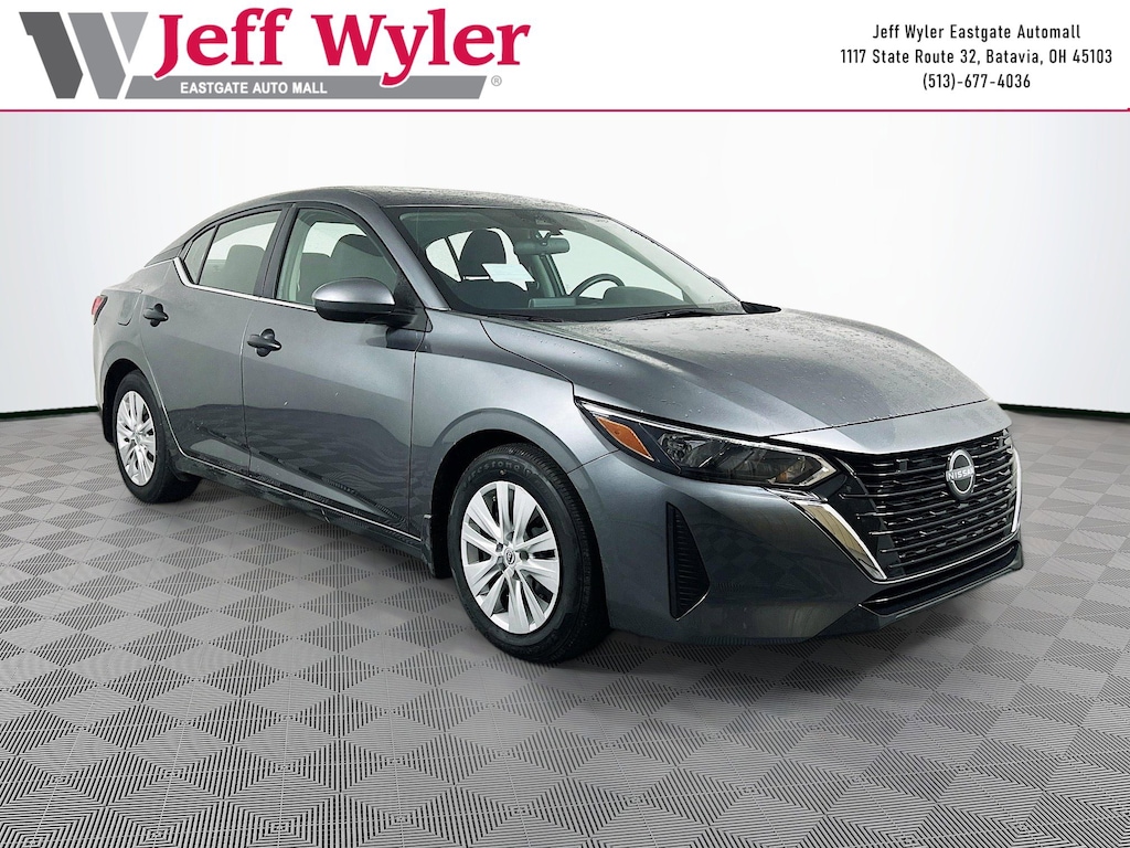 Jeff Wyler Eastgate Auto Mall is delighted to offer this good-looking 2025 Nissan Sentra S in Gun Metallic. Well equipped with: 4 Speakers, ABS brakes, Air Conditioning, AM/FM radio, Auto High-beam Headlights, Blind Spot Warning, Body Colored Splash Guards (4-Piece), Brake assist, Bumpers: body-color, Carpeted Floor Mats with Trunk Mat, Cloth Seat Trim, Delay-off headlights, Driver door bin, Driver vanity mirror, Dual front impact airbags, Dual front side impact airbags, Electronic Stability Control, Four wheel independent suspension, Front anti-roll bar, Front Bucket Seats, Front Center Armrest, Front reading lights, Fully automatic headlights, Illuminated entry, Knee airbag, Low tire pressure warning, NissanConnect featuring Apple CarPlay and Android Auto, Occupant sensing airbag, Outside temperature display, Overhead airbag, Overhead console, Panic alarm, Passenger door bin, Passenger vanity mirror, Power door mirrors, Power steering, Power windows, Radio data system, Radio: AM/FM with RDS/MP3/Aux-in, Rear anti-roll bar, Rear Parking Sensors, Rear side impact airbag, Rear window defroster, Remote keyless entry, Speed control, Speed-sensing steering, Split folding rear seat, Steering wheel mounted audio controls, Tachometer, Telescoping steering wheel, Tilt steering wheel, Traction control, Trip computer, Variably intermittent wipers, and Wheels: 16" Steel with Full Covers. Clean CARFAX. Ask about available certifications. Used vehicles 10 years of age or newer with less than 100,000 miles are eligible for the Wyler Assurance Program, but eligible vehicles must pass our reconditioning process and multi-point inspection. Provided the vehicle passes inspection, vehicles will be eligible for the 6 month/6,000 mile limited warranty. The 6 month/6,000 mile limited warranty is NOT available on AS-IS vehicles, wholesale vehicles, lease buyback/pass-thru vehicles or un-inspected vehicles. Note that this program can also apply to vehicles where the remaining factory coverage is less than 6 months or 6,000 miles. Please check the Federal Trade Commission (FTC) Buyers guide on the vehicle for full details as to whether or not warranty coverage may apply. Contact Dealer for additional details. The Wyler Assurance 6 month/6,000 Mile limited warranty ends 6 months from the date of the Retail Purchase Agreement (BUYERS ORDER) or when the vehicle's odometer registers 6,000 additional miles to the mileage listed on the BUYERS ORDER, whichever comes first. Your Deductible - The warranty holder on your contract pays the first $100 of each covered repair.