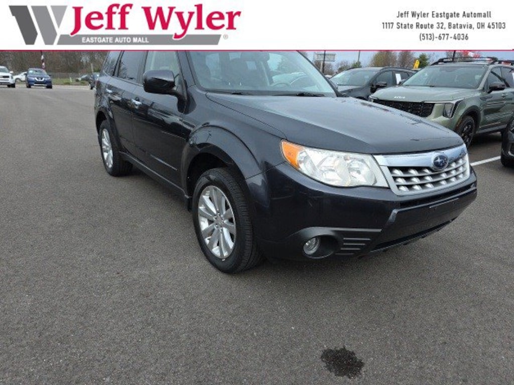 Jeff Wyler Eastgate Auto Mall is excited to offer this good-looking 2011 Subaru Forester 2.5X in Dark Gray Metallic. Well equipped with: 17" x 7.0JJ Aluminum Alloy Wheels, 4-Wheel Disc Brakes, 4.44 Axle Ratio, 6 Speakers, ABS brakes, Adapter, Air Conditioning, All Weather Floor Mats, Alloy wheels, AM/FM radio, Anti-whiplash front head restraints, Auto-Dimming Mirror w/Compass & HomeLink, Automatic temperature control, Back-Up Camera, Brake assist, Bumpers: body-color, CD player, Dark Gray Metallic Spoiler, Driver door bin, Driver vanity mirror, Dual front impact airbags, Dual front side impact airbags, Electronic Stability Control, Four wheel independent suspension, Front anti-roll bar, Front Bucket Seats, Front Center Armrest, Front fog lights, Front reading lights, Heated door mirrors, Heated Front Bucket Seats, Heated front seats, Illuminated entry, Leather Shift Knob, Low tire pressure warning, Occupant sensing airbag, Outside temperature display, Overhead airbag, Overhead console, Panic alarm, Passenger door bin, Passenger vanity mirror, Perforated Leather-Trimmed Upholstery, Power door mirrors, Power driver seat, Power moonroof, Power steering, Power windows, Radio data system, Radio: AM/FM Stereo w/HD Radio & Single CD Player, Rear anti-roll bar, Rear Bumper Cover, Rear seat center armrest, Rear window defroster, Rear window wiper, Remote keyless entry, Roof rack: rails only, Security system, Speed control, Splash Guard Kit, Split folding rear seat, Steering wheel mounted audio controls, Tachometer, Telescoping steering wheel, Tilt steering wheel, Traction control, Trip computer, and Variably intermittent wipers. Reviews: * If you like your SUVs to be true to the "Utility" in "Sport Utility Vehicle," while still being small enough to comfortably maneuver in a city, the Forester may be the vehicle for you. With a low starting price, standard AWD, proven reliability, more towing power than many others in its class and great visibility all around, thereâs certainly a lot to love. Source: KBB.com * Standard all-wheel drive; roomy cabin with ample cargo space; comfortable ride; strong turbocharged engine on XT trims. Source: EdmundsAwards: * 2011 IIHS Top Safety Pick * 2011 KBB.com Best Resale Value Awards Ask about available certifications. Used vehicles 10 years of age or newer with less than 100,000 miles are eligible for the Wyler Assurance Program, but eligible vehicles must pass our reconditioning process and multi-point inspection. Provided the vehicle passes inspection, vehicles will be eligible for the 6 month/6,000 mile limited warranty. The 6 month/6,000 mile limited warranty is NOT available on AS-IS vehicles, wholesale vehicles, lease buyback/pass-thru vehicles or un-inspected vehicles. Note that this program can also apply to vehicles where the remaining factory coverage is less than 6 months or 6,000 miles. Please check the Federal Trade Commission (FTC) Buyers guide on the vehicle for full details as to whether or not warranty coverage may apply. Contact Dealer for additional details. The Wyler Assurance 6 month/6,000 Mile limited warranty ends 6 months from the date of the Retail Purchase Agreement (BUYERS ORDER) or when the vehicle's odometer registers 6,000 additional miles to the mileage listed on the BUYERS ORDER, whichever comes first. Your Deductible - The warranty holder on your contract pays the first $100 of each covered repair.