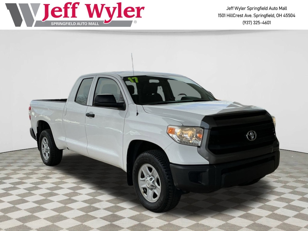 Jeff Wyler Springfield Auto Mall is pleased to offer this stunning 2017 Toyota Tundra SR in White. Well equipped with: ABS brakes, Electronic Stability Control, Heated door mirrors, Illuminated entry, Low tire pressure warning, Remote keyless entry, Traction control, 18" x 8J Styled Steel Wheels, 3-Passenger Front Bench Seat, 3.91 Axle Ratio, 4-Wheel Disc Brakes, 6 Speakers, Air Conditioning, AM/FM radio, Brake assist, CD player, Driver door bin, Dual front impact airbags, Dual front side impact airbags, Exterior Parking Camera Rear, Fabric Seat Trim, Front anti-roll bar, Front Center Armrest w/Storage, Front reading lights, Front wheel independent suspension, Knee airbag, Occupant sensing airbag, Outside temperature display, Overhead airbag, Overhead console, Panic alarm, Passenger door bin, Power door mirrors, Power steering, Power windows, Radio: Entune AM/FM/CD, Rear reading lights, Rear step bumper, Speed control, Speed-sensing steering, Split folding rear seat, Tachometer, Tilt steering wheel, and Variably intermittent wipers. Awards: * 2017 KBB.com 10 Most Awarded Brands * 2017 KBB.com Best Resale Value Awards Ask about available certifications. Used vehicles 10 years of age or newer with less than 100,000 miles are eligible for the Wyler Assurance Program, but eligible vehicles must pass our reconditioning process and multi-point inspection. Provided the vehicle passes inspection, vehicles will be eligible for the 6 month/6,000 mile limited warranty. The 6 month/6,000 mile limited warranty is NOT available on AS-IS vehicles, wholesale vehicles, lease buyback/pass-thru vehicles or un-inspected vehicles. Note that this program can also apply to vehicles where the remaining factory coverage is less than 6 months or 6,000 miles. Please check the Federal Trade Commission (FTC) Buyers guide on the vehicle for full details as to whether or not warranty coverage may apply. Contact Dealer for additional details. The Wyler Assurance 6 month/6,000 Mile limited warranty ends 6 months from the date of the Retail Purchase Agreement (BUYERS ORDER) or when the vehicle's odometer registers 6,000 additional miles to the mileage listed on the BUYERS ORDER, whichever comes first. Your Deductible - The warranty holder on your contract pays the first $100 of each covered repair.