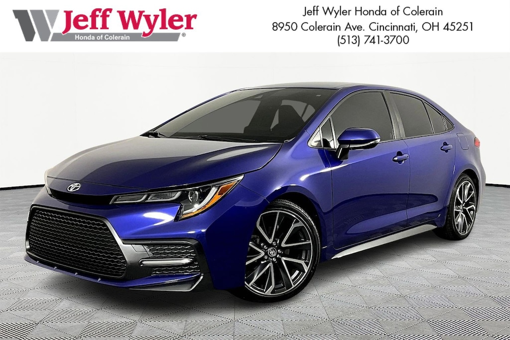 Jeff Wyler Honda of Colerain is pumped up to offer this good-looking 2020 Toyota Corolla SE in Blue Crush Metallic. Well equipped with: 18" Machined Alloy Wheels, 4-Wheel Disc Brakes, 6 Speakers, ABS brakes, Air Conditioning, Alloy wheels, AM/FM radio: SiriusXM, Apple CarPlay, Auto High-beam Headlights, Automatic temperature control, Brake assist, Bumpers: body-color, Delay-off headlights, Driver door bin, Driver vanity mirror, Dual front impact airbags, Dual front side impact airbags, Electronic Stability Control, Emergency communication system: Safety Connect with 3-year trial, Exterior Parking Camera Rear, Four wheel independent suspension, Front anti-roll bar, Front Bucket Seats, Front Center Armrest, Front reading lights, Front Sport Seats, Fully automatic headlights, Heated door mirrors, Illuminated entry, Knee airbag, Leather Shift Knob, Low tire pressure warning, Occupant sensing airbag, Outside temperature display, Overhead airbag, Panic alarm, Passenger door bin, Passenger vanity mirror, Power door mirrors, Power steering, Power windows, Premium Fabric Seat Trim, Radio data system, Radio: Audio AM/FM w/Navigation, Rear anti-roll bar, Rear seat center armrest, Rear window defroster, Remote keyless entry, Security system, Speed control, Split folding rear seat, Spoiler, Steering wheel mounted audio controls, Tachometer, Telescoping steering wheel, Tilt steering wheel, Traction control, Trip computer, Turn signal indicator mirrors, and Variably intermittent wipers.